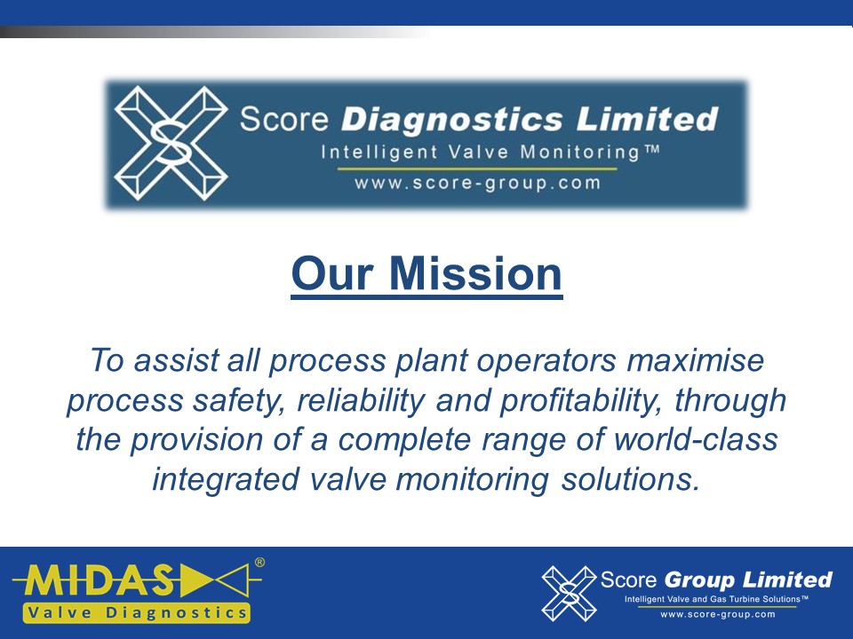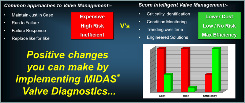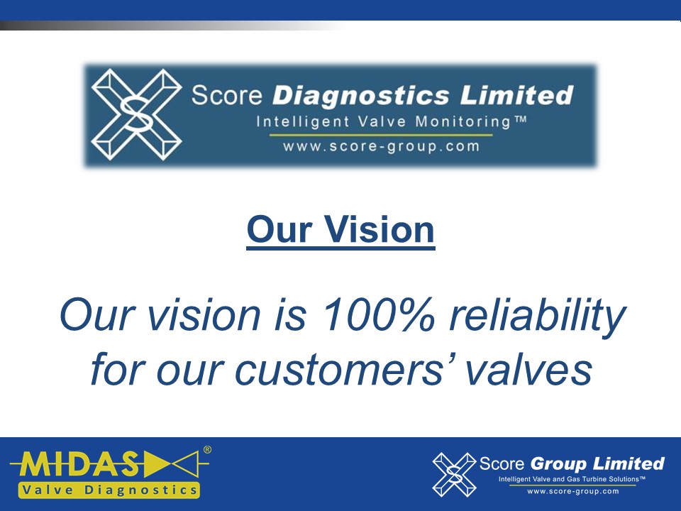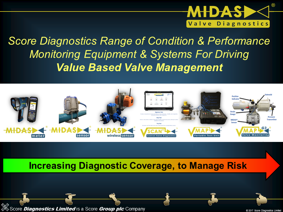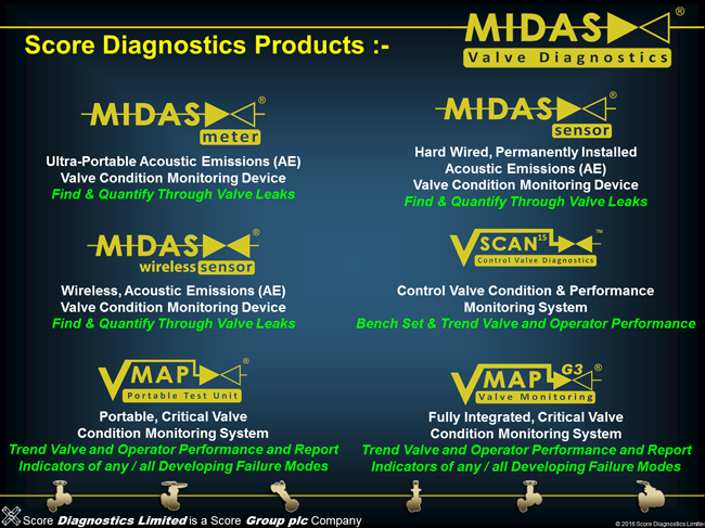 The MIDAS® Valve Diagnostics Range of products is exclusive to Score Group Limited, and currently includes the MIDAS Meter®, MIDAS® Sensor and V-MAP® G3. Please click on any of the buttons above to find out more about each specific product.”